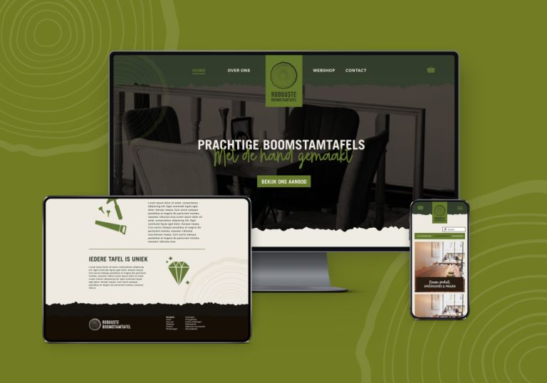 Deze unieke boomstamtafels worden met liefde en vakmanschap gemaakt en zijn stuk voor stuk unieke exemplaren. Elke boom is anders en daarom heeft elke tafel ook zijn eigen verhaal. Tijdens De Creatieve Fundatie kwamen we tot de kern van dit bedrijf, zo formuleerden we de kernwaarden, missie, visie en de beleving van Robuuste Boomstamtafel. Hierna creëerden we een passend logo, unieke huisstijl en ontwerp voor de webshop.